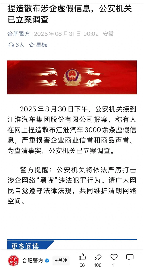8月31日凌晨,“合肥警方”微信公眾號發(fā)文稱,2025年8月30日下午,公安機(jī)關(guān)接到江淮汽車集團(tuán)股份有限公司報案,稱有人在網(wǎng)上捏造散布江淮汽車3000余條虛假信息,嚴(yán)重?fù)p害企業(yè)商業(yè)信譽(yù)和商品聲譽(yù)。為查清事實(shí),公安機(jī)關(guān)已立案調(diào)查。