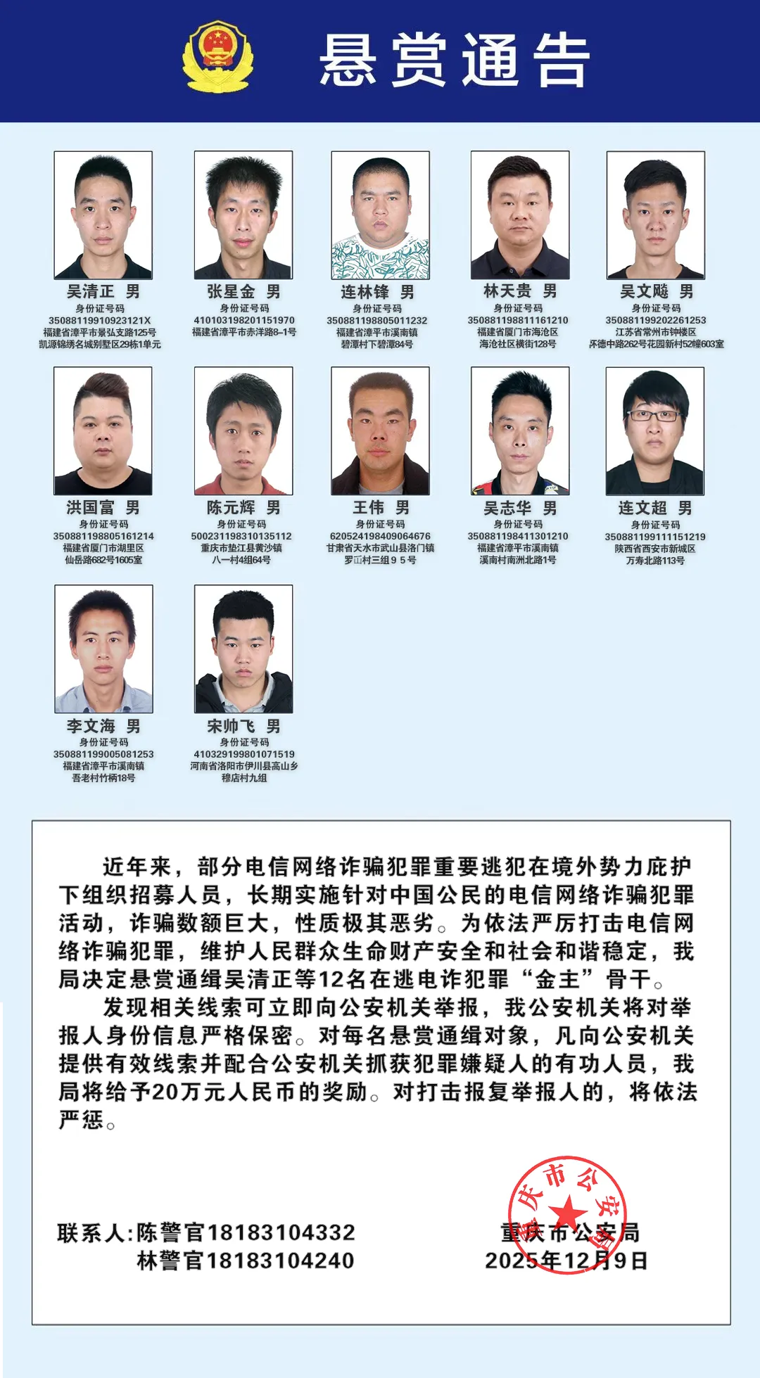 經(jīng)查,近年來(lái),吳啟平、吳清正、傅小濱、歐長(zhǎng)華等犯罪嫌疑人在境外勢(shì)力庇護(hù)下,組織招募人員,長(zhǎng)期實(shí)施針對(duì)中國(guó)公民的電信網(wǎng)絡(luò)詐騙犯罪活動(dòng),詐騙數(shù)額巨大,性質(zhì)極其惡劣。特別是公安部部署開(kāi)展打擊緬北涉我犯罪專項(xiàng)工作以來(lái),在公安機(jī)關(guān)嚴(yán)打高壓態(tài)勢(shì)下,上述犯罪嫌疑人仍不收斂、不收手,繼續(xù)大肆組織實(shí)施違法犯罪活動(dòng)。該批在逃人員犯罪事實(shí)清楚、證據(jù)確鑿充分,浙江杭州、溫州,福建泉州、龍巖,河南平頂山,廣東深圳,云南昆明和重慶等地公安機(jī)關(guān)決定對(duì)其進(jìn)行公開(kāi)懸賞通緝。