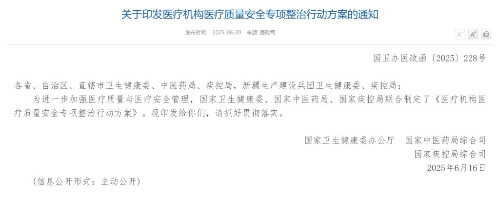 根據(jù)當(dāng)天公布的《醫(yī)療機(jī)構(gòu)醫(yī)療質(zhì)量安全專項(xiàng)整治行動(dòng)方案》,自今年6月起到2026年5月底,國(guó)家衛(wèi)生健康委、國(guó)家中醫(yī)藥局、國(guó)家疾控局在全國(guó)開(kāi)展為期一年的醫(yī)療質(zhì)量安全專項(xiàng)整治行動(dòng),覆蓋所有二級(jí)以上醫(yī)療機(jī)構(gòu)。