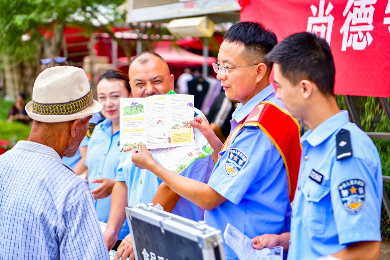 7月26日,新疆新和縣公安局聯(lián)合縣市場監(jiān)督管理局、疾控中心等單位,在該縣金橋廣場、牛羊市場、玫瑰商業(yè)廣場等地開展形式多樣的食品安全知識(shí)普法宣傳活動(dòng)。夏日熱浪中,警民熱情互動(dòng),共話食品安全。