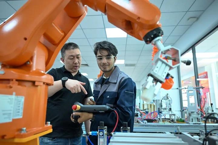 6月16日,在天津現(xiàn)代職業(yè)技術(shù)學(xué)院魯班工坊實(shí)訓(xùn)教室,教師指導(dǎo)學(xué)生操作設(shè)備。新華社記者 孫凡越 攝