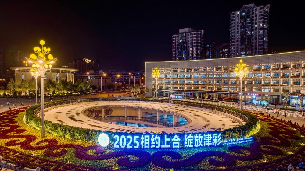 這是8月22日拍攝的位于天津站后廣場的“2025相約上合 綻放津彩”標(biāo)識(無人機照片)。新華社記者趙子碩攝