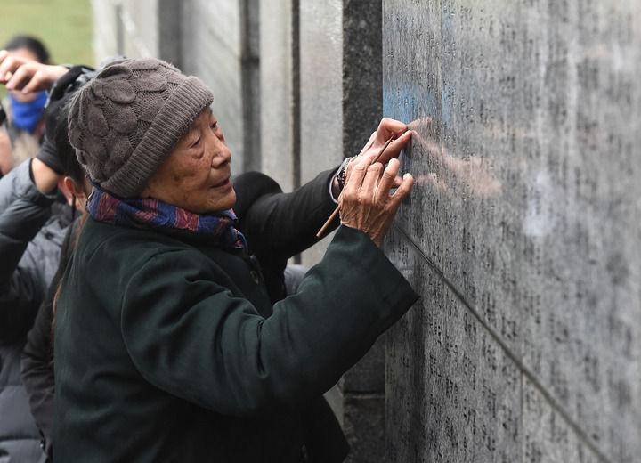 2018年12月10日,在侵華日軍南京大屠殺遇難同胞紀(jì)念館舉行的死難者遺屬家祭活動(dòng)中,夏淑琴給遇難者名單墻上親人的名字添漆。新華社記者 孫參 攝