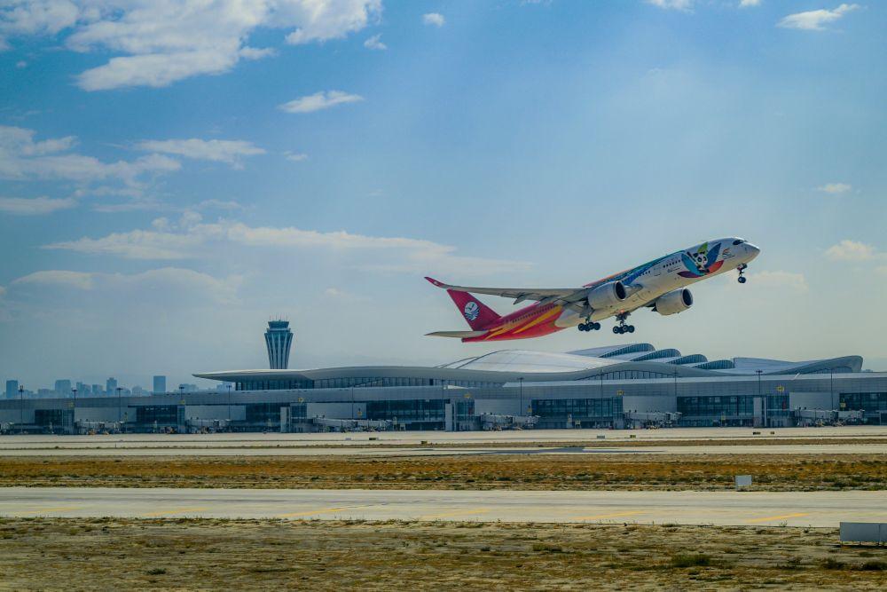 9月15日,一架飛機(jī)從烏魯木齊天山國(guó)際機(jī)場(chǎng)起飛。新華社記者 陳朔 攝