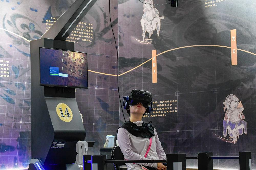 2024年7月22日,游客在“尋境敦煌——數(shù)字敦煌沉浸展”借助VR設(shè)備沉浸式游覽莫高窟第285窟虛擬場(chǎng)景。“尋境敦煌——數(shù)字敦煌沉浸展”綜合運(yùn)用VR虛擬現(xiàn)實(shí)、三維建模、游戲引擎的物理渲染和全局動(dòng)態(tài)光照等新技術(shù),高精度立體還原了莫高窟第285窟。游客戴上VR眼鏡,不僅可以零距離觀賞壁畫(huà)、360度自由探索洞窟細(xì)節(jié),還能“飛升”到窟頂,身臨其境參與壁畫(huà)故事情節(jié),沉浸式感受敦煌文化的魅力。