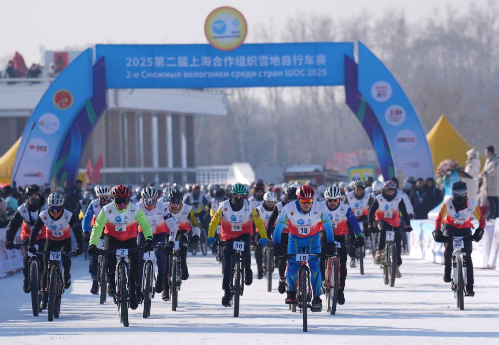2025年1月11日,選手在哈爾濱太陽島風(fēng)景區(qū)參加2025第二屆上海合作組織雪地自行車賽。