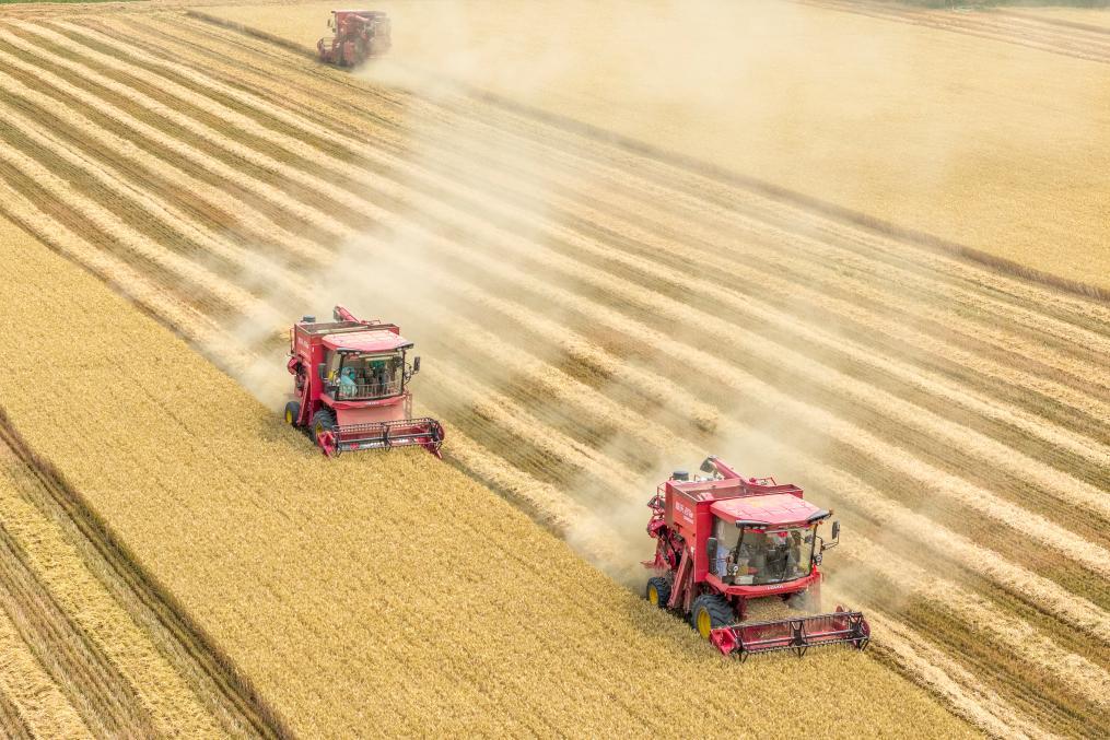2025年6月9日,河南省三門峽靈寶市西閻鄉(xiāng)東古驛村村民在搶收小麥(無人機(jī)照片)。新華社發(fā)(杜杰攝)