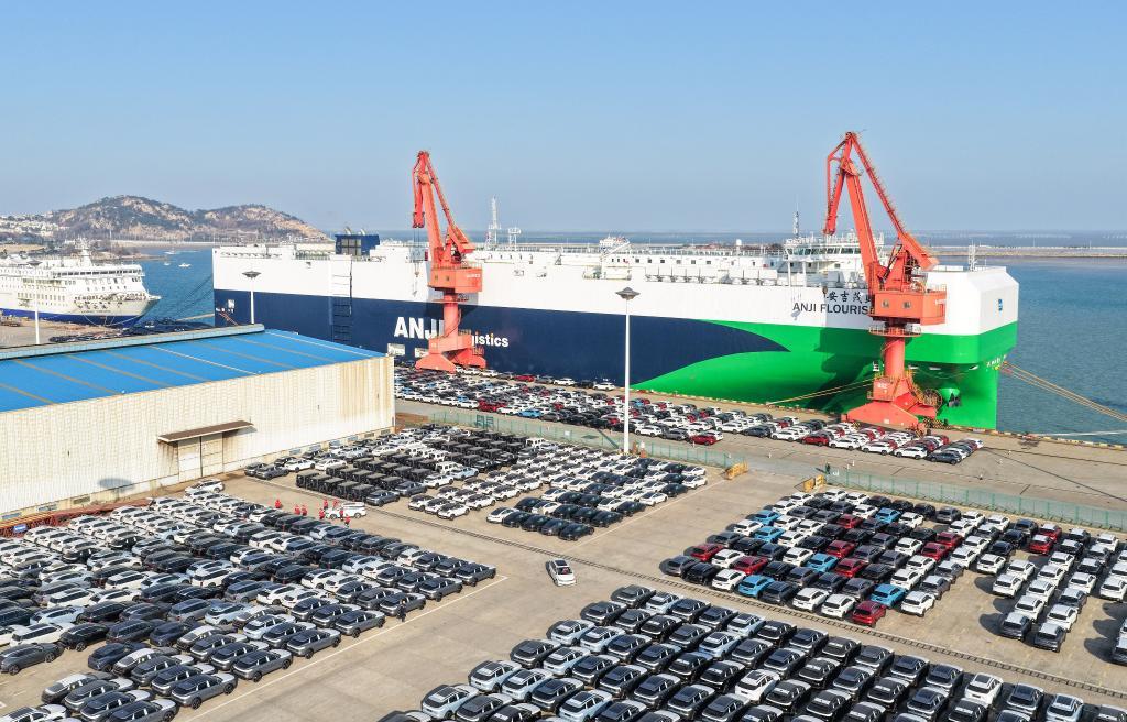 2025年12月17日,在江蘇連云港港,一艘滾裝船在裝運(yùn)出口汽車(無人機(jī)照片)。新華社發(fā)(王健民攝)