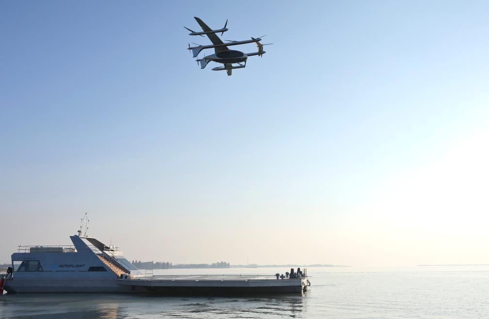 2025年11月22日,在江蘇昆山的峰飛航空全球科技日活動(dòng)中,一架電動(dòng)垂直起降飛行器從“水上機(jī)場(chǎng)”起飛。新華社記者 方喆 攝