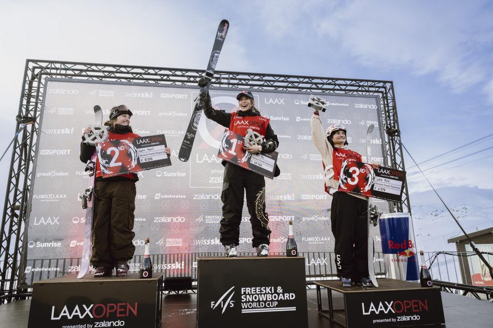 2026年1月17日,在瑞士萊克斯舉行的國際雪聯(lián)世界杯系列賽中獲得女子自由式滑雪坡面障礙技巧冠軍的谷愛凌(中)在領(lǐng)獎臺上。新華社發(fā)(馬塞爾·萊默希特攝)