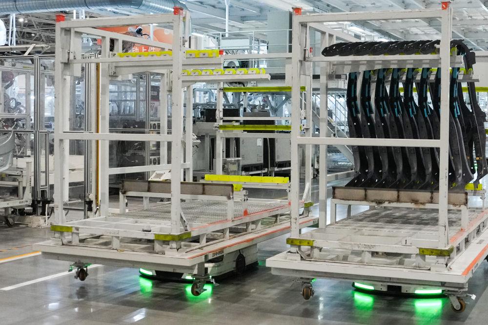 從研發(fā)制造到測試應(yīng)用,北京發(fā)揮汽車產(chǎn)業(yè)長期積累,積極擁抱新品牌、新技術(shù),新模式,新能源汽車產(chǎn)業(yè)蓬勃發(fā)展,產(chǎn)業(yè)鏈供應(yīng)鏈不斷鞏固完善。這是自主移動機(jī)器人在北京小米汽車工廠搬運(yùn)物資(2025年6月16日攝)。