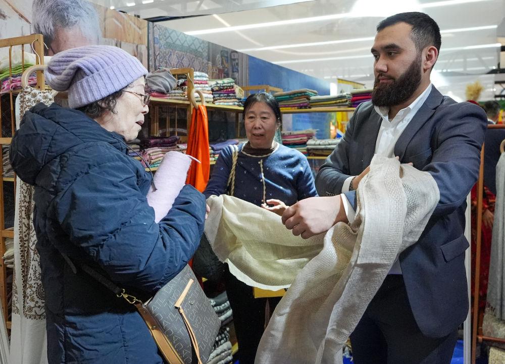 2026年2月4日,在“共享大市場(chǎng)·出口中國(guó)”2026年首場(chǎng)活動(dòng)暨北京國(guó)際精品薈的進(jìn)口商品推介區(qū),參觀者(左)購買展出的烏茲別克斯坦圍巾。當(dāng)日,“共享大市場(chǎng)·出口中國(guó)”2026年首場(chǎng)活動(dòng)暨北京國(guó)際精品薈啟動(dòng)活動(dòng)在灣里·王府井WellTown舉行,現(xiàn)場(chǎng)打造了“一站式”全球好物采購展區(qū),為市民新春消費(fèi)注入活力。