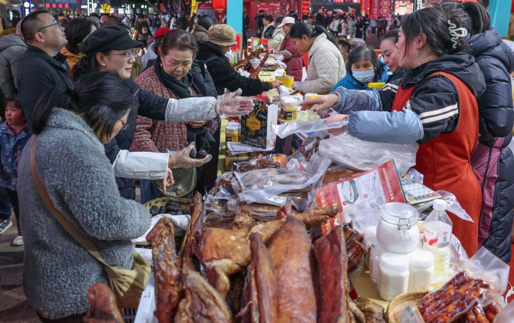 2026年2月1日,在重慶市兩江新區(qū)觀音橋步行街,市民在現(xiàn)場(chǎng)選購巴渝“土特產(chǎn)”。當(dāng)日,巴渝“土特產(chǎn)”名優(yōu)百品年貨季在重慶啟幕。本次年貨季吸引近百家經(jīng)營(yíng)主體參展,集中展示重慶各地優(yōu)質(zhì)土特產(chǎn)。