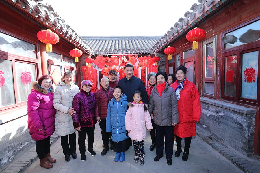 2019年2月1日上午,習(xí)近平總書記來(lái)到前門東區(qū)草廠四條胡同看望慰問(wèn)群眾時(shí),同市民侯雅明一家合影。新華社記者 鞠鵬 攝