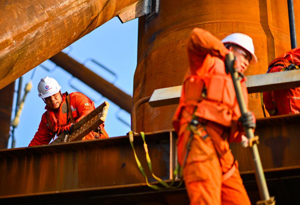 2026年2月13日,工人在位于渤海中部海域的渤中26-6油田開發(fā)項(xiàng)目(二期)作業(yè)現(xiàn)場施工。新華社記者 趙子碩 攝