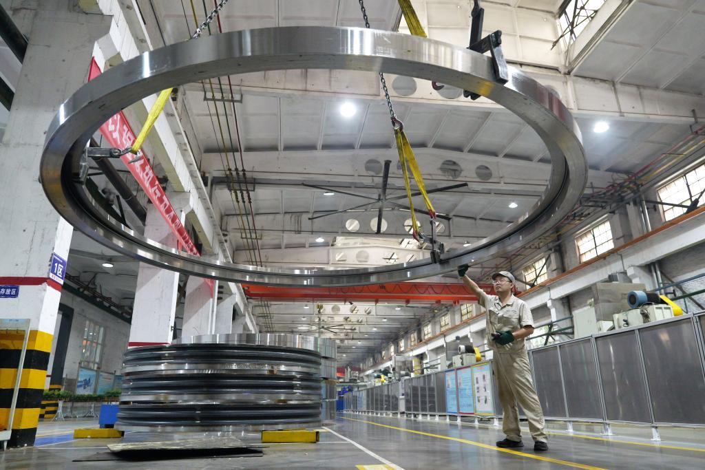 2025年5月22日,工人在洛陽軸承集團(tuán)股份有限公司風(fēng)電三車間生產(chǎn)線上作業(yè)。新華社記者 李嘉南 攝