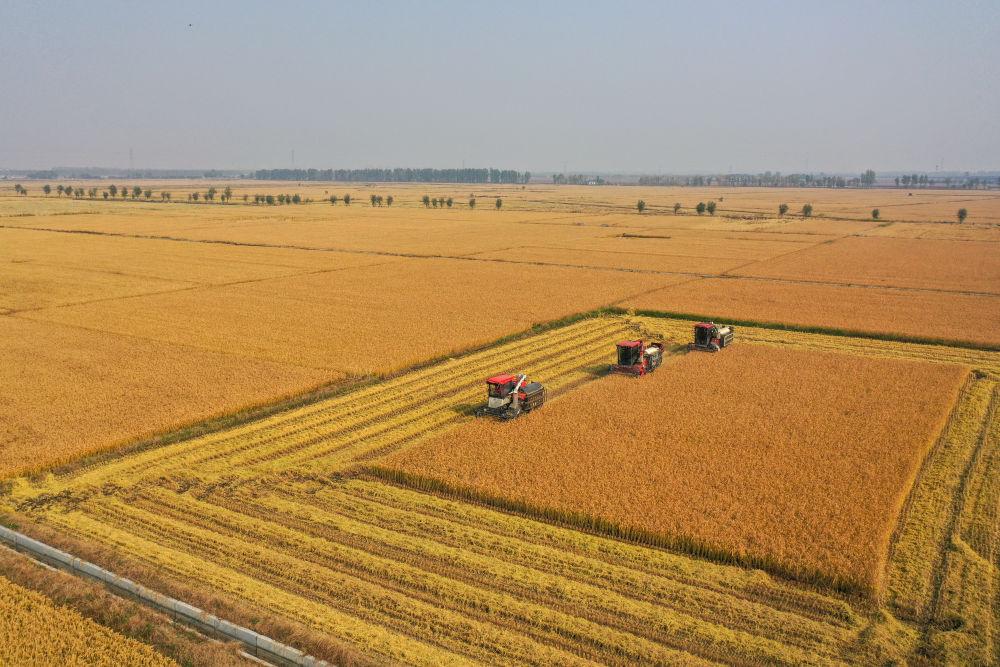 在吉林省公主嶺市,吉林省米兜種植農(nóng)民專業(yè)合作社進(jìn)行機(jī)械化收割水稻作業(yè)展示(2025年10月14日攝,無(wú)人機(jī)照片)。新華社記者 張楠 攝