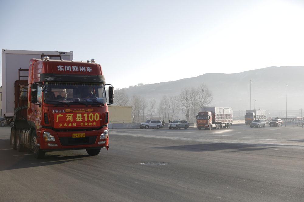 2023年12月26日,在甘肅省臨夏州積石山高速出口,載著活動(dòng)板房的貨車(chē)駛向受災(zāi)鄉(xiāng)鎮(zhèn)。新華社記者 方欣 攝