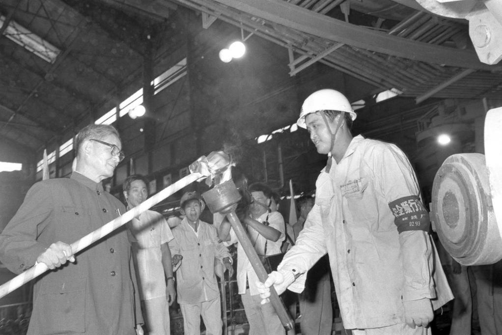 1985年9月15日,我國第一座日產(chǎn)萬噸鐵的高爐——寶鋼一號高爐點(diǎn)火試生產(chǎn)。這是宋平同志(左一)為高爐點(diǎn)火。