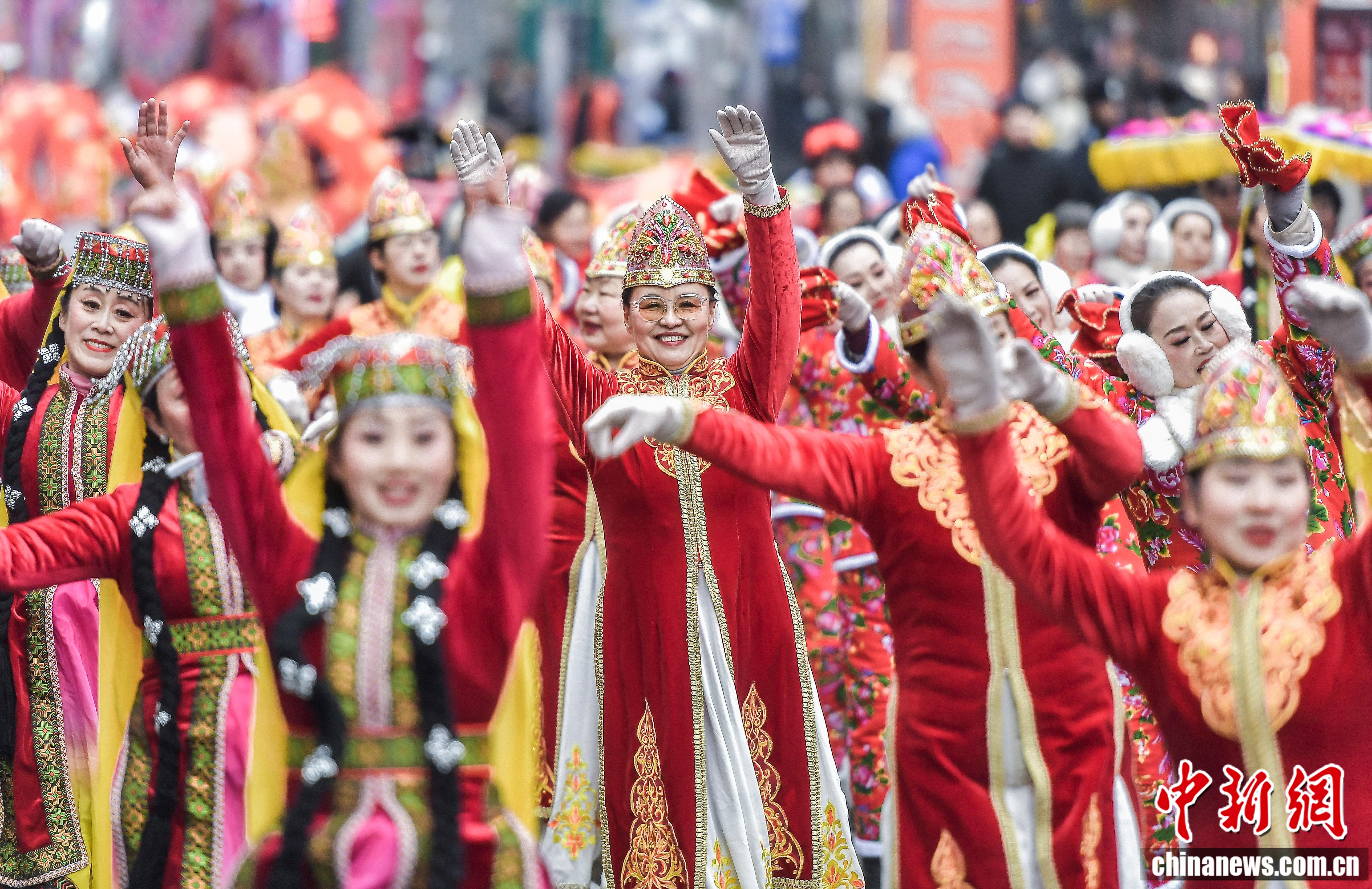 2026年2月5日,新疆烏魯木齊市鬧市區(qū)西門老街鑼鼓喧天,一場社火展演游街活動(dòng)在此舉行,圖為社火隊(duì)伍的服飾、舞蹈等融入諸多新疆元素。中新社記者 劉新 攝