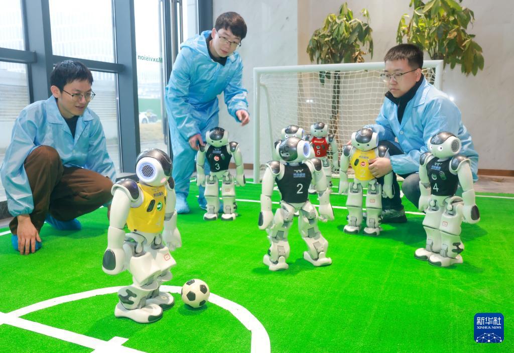 3月16日,湖北光谷盛創(chuàng)技術(shù)人員對機(jī)器人足球競技對抗系統(tǒng)進(jìn)行調(diào)試。新華社發(fā)(趙軍攝)