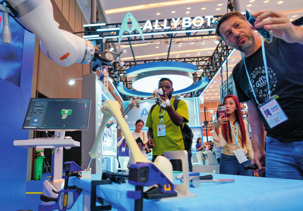 海外采購商在第138屆廣交會元化智能科技(深圳)有限公司展臺觀看手術(shù)機器人產(chǎn)品(2025年10月19日攝)。肖恩楠攝/本刊