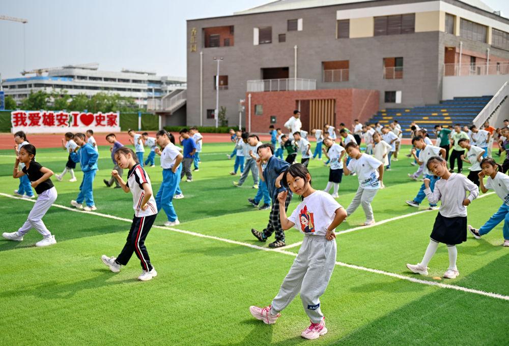 2024年5月21日,雄安史家胡同小學(xué)學(xué)生在操場上做操。按照統(tǒng)一安排,北京四中、北京史家胡同小學(xué)、北京北海幼兒園等知名校(園)長在雄安新區(qū)設(shè)立領(lǐng)航名校長工作室,推動優(yōu)質(zhì)中小學(xué)基礎(chǔ)教育資源同雄安實現(xiàn)共享。