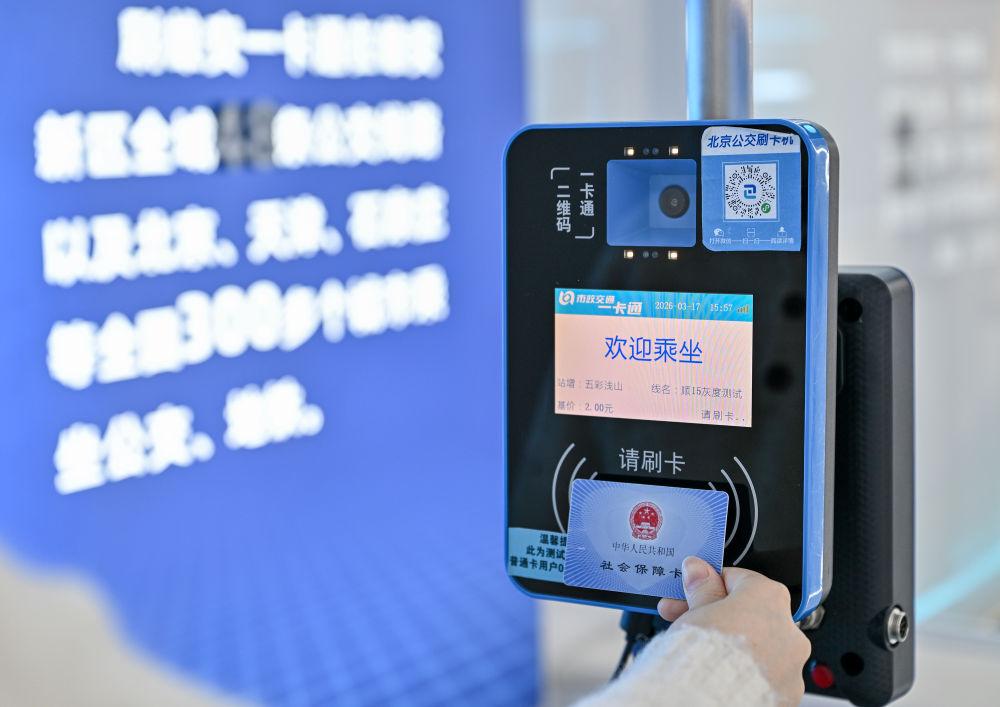 2026年3月17日,雄安一卡通體驗館的工作人員演示刷社保卡乘坐公交車。