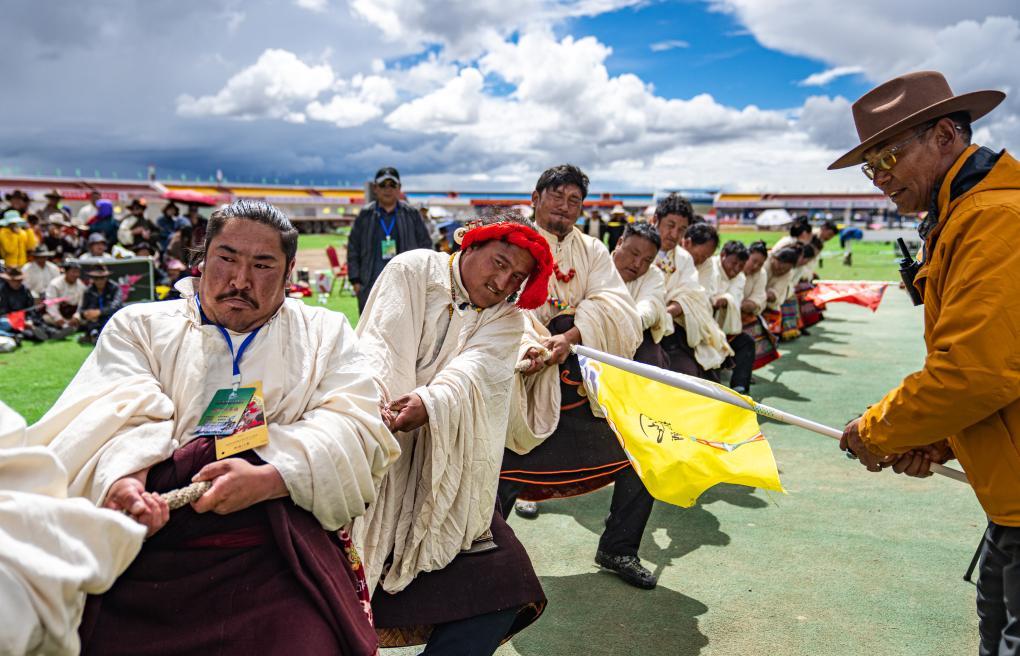 ??2025年9月6日,在那曲市恰青賽馬節(jié)現(xiàn)場,農(nóng)牧民參加拔河比賽。新華社記者 丁增尼達(dá) 攝