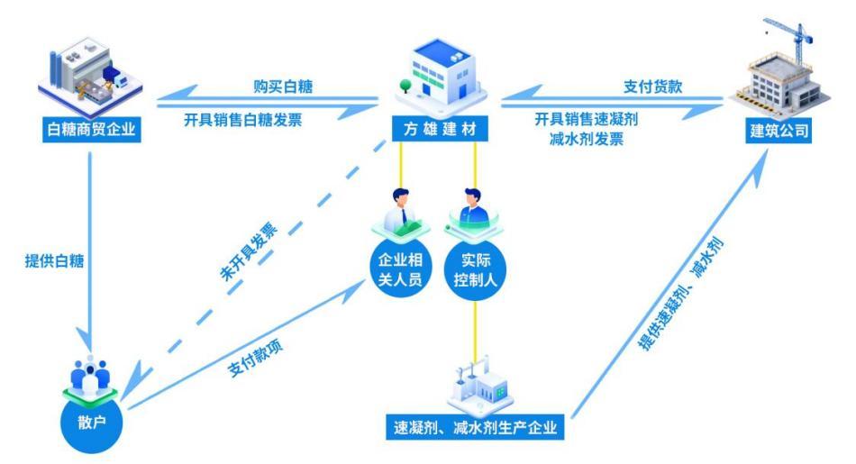 在完整固定證據(jù)鏈后,檢查人員約談實(shí)際控制人,最終公司實(shí)際控制人馬寧主動(dòng)如實(shí)供述了違法事實(shí):為規(guī)避稅收監(jiān)管方雄建材采購(gòu)白糖后,憑借“真實(shí)采購(gòu)獲進(jìn)項(xiàng)、賬外銷售隱銷項(xiàng)”形成富余票;通過(guò)控制關(guān)聯(lián)公司向多地的53家公司銷售速凝劑、減水劑,由方雄建材利用富余票對(duì)外開(kāi)具增值稅專用發(fā)票的違法事實(shí)。