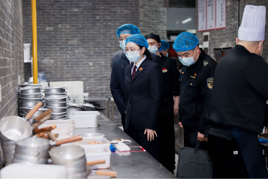 圖為檢察干警與執(zhí)法人員核查商戶后廚食品安全問(wèn)題。