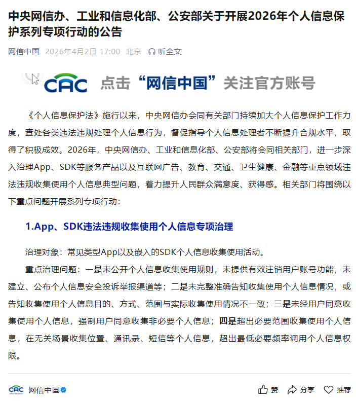 《個(gè)人信息保護(hù)法》施行以來,中央網(wǎng)信辦會同有關(guān)部門持續(xù)加大個(gè)人信息保護(hù)工作力度,查處各類違法違規(guī)處理個(gè)人信息行為,督促指導(dǎo)個(gè)人信息處理者不斷提升合規(guī)水平,取得了積極成效。2026年,中央網(wǎng)信辦、工業(yè)和信息化部、公安部將會同相關(guān)部門,進(jìn)一步深入治理App、SDK等服務(wù)產(chǎn)品以及互聯(lián)網(wǎng)廣告、教育、交通、衛(wèi)生健康、金融等重點(diǎn)領(lǐng)域違法違規(guī)收集使用個(gè)人信息典型問題,著力提升人民群眾滿意度、獲得感。相關(guān)部門將圍繞以下重點(diǎn)問題開展系列專項(xiàng)行動: