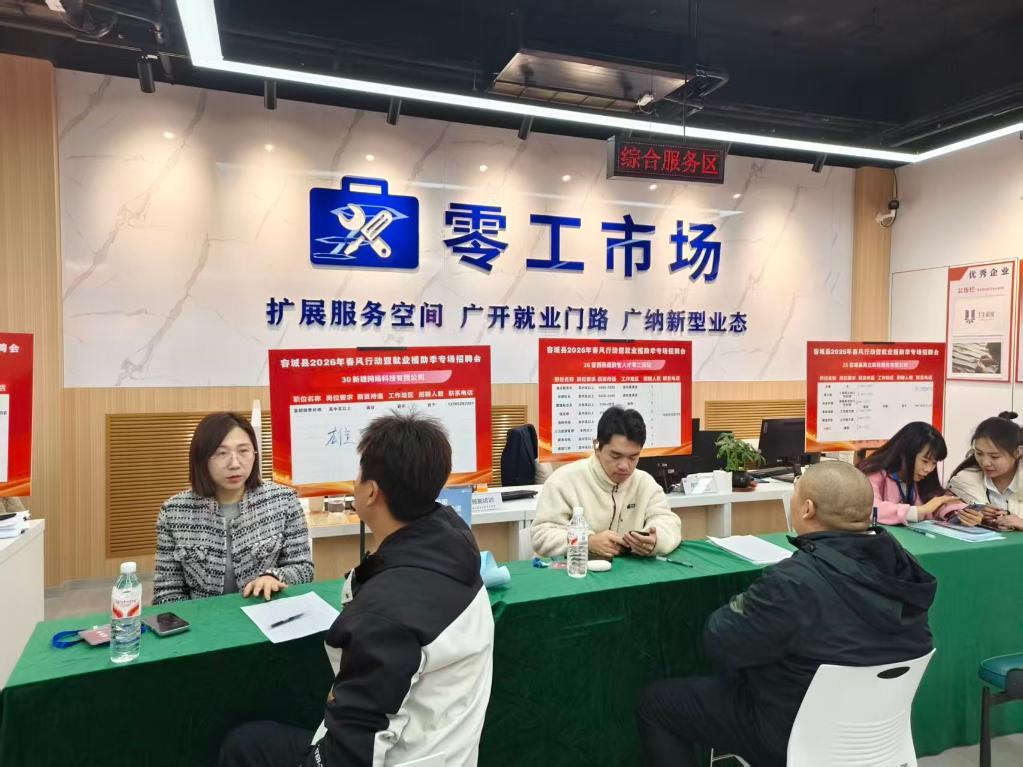 回遷居民在容東零工市場舉辦的專場招聘會上咨詢崗位情況(2026年3月攝)。(受訪者供圖)