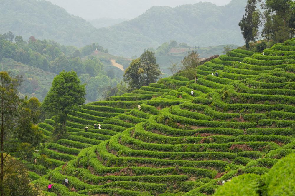 4月5日,人們?cè)谒拇ㄊ⊙虐彩信D肫喝f(wàn)畝觀光茶園體驗(yàn)采茶。新華社記者 胥冰潔 攝
