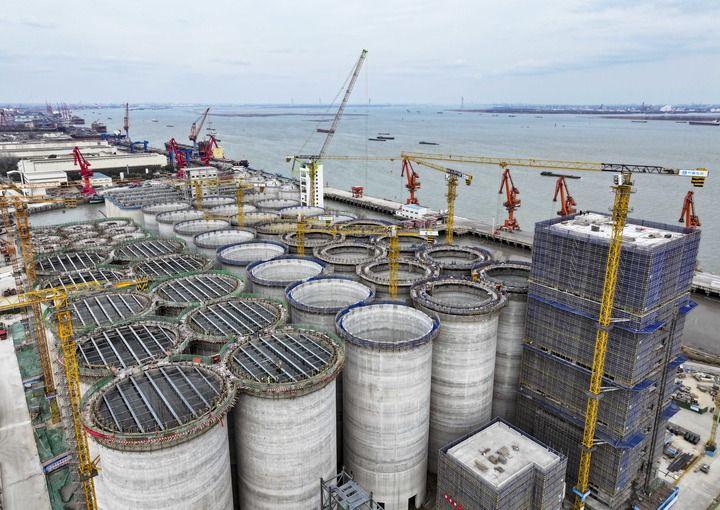 在江蘇省靖江市拍攝的中糧靖江碼頭倉儲物流項目建設(shè)現(xiàn)場(2025年2月20日攝,無人機照片)。新華社發(fā)(顧繼紅攝)