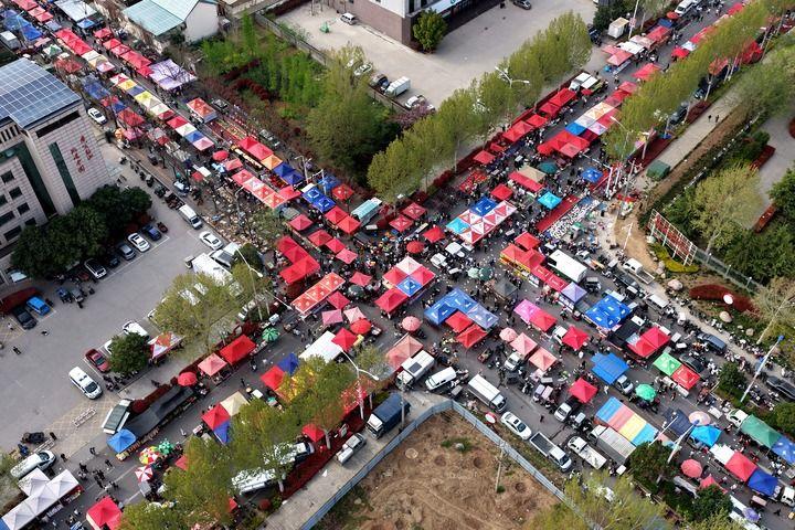 人們在河南省濟源市思禮鎮(zhèn)清明集市趕集(2026年4月4日攝,無人機照片)。新華社發(fā)(段二平 攝)