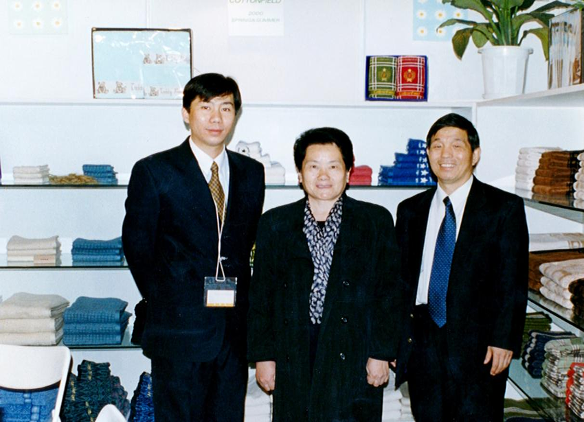 2000年3月北京中國國際紡織品博覽會上,原中國紡織工業(yè)部部長吳文英(中)、原中國家用紡織品協(xié)會會長楊東輝(右)在南華實(shí)業(yè)公司展位前與馬濤(左)合影。展位商品所使用的標(biāo)識即為“無印良品”。