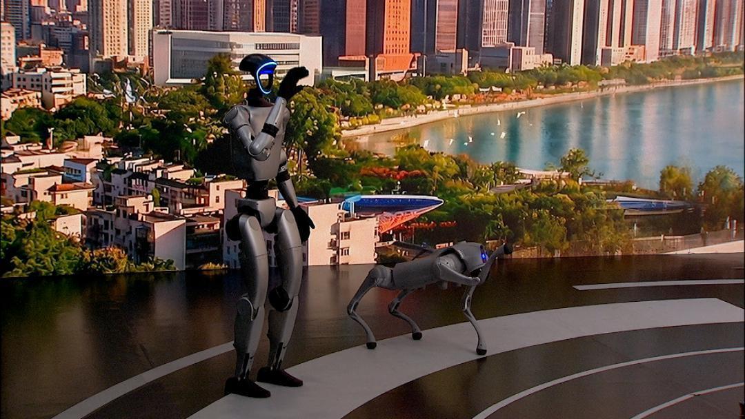 圖為節(jié)目現(xiàn)場展示的機(jī)器人及機(jī)器狗。