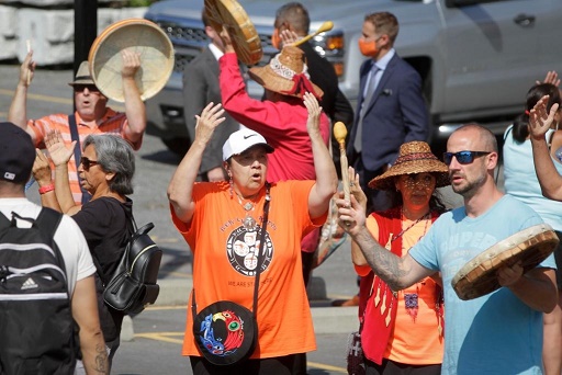 8月10日,在加拿大北溫哥華“圣保羅印第安寄宿學(xué)?!迸f址,人們在新聞發(fā)布會后擊鼓、唱歌。加拿大不列顛哥倫比亞省的三個原住民部族10日宣布,將對位于北溫哥華的“圣保羅印第安寄宿學(xué)?!迸f址展開調(diào)查。(新華社發(fā),梁森攝)