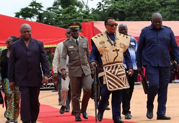 5月20日,在剛果(布)桑加省首府韋索市,剛果(布)總統(tǒng)薩蘇(前排中)出席韋索-博科拉道路及桑加大橋項目開工典禮。新華社發(fā)(中國路橋公司供圖)