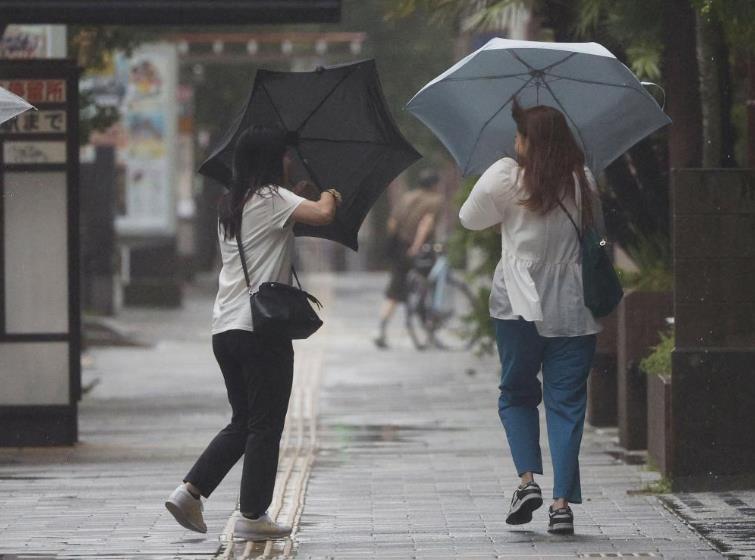 2024年8月29日,行人在強風(fēng)中走在日本鹿兒島縣鹿兒島市街頭。新華社/共同社
