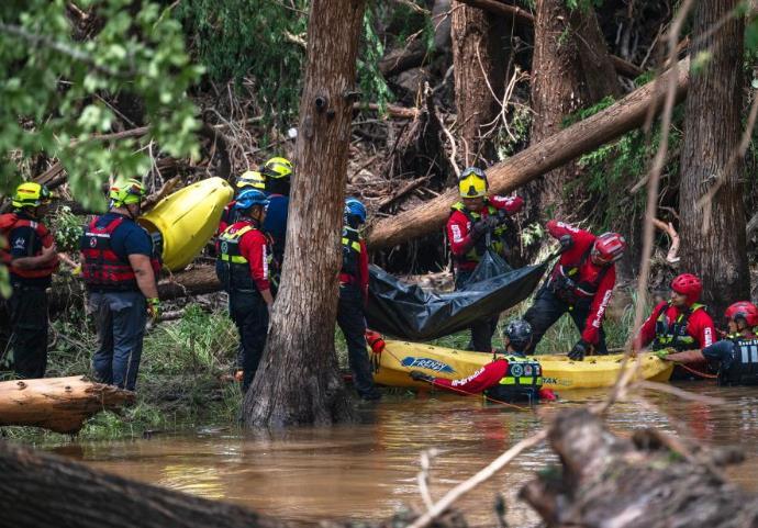 7月7日,救援人員在美國(guó)得克薩斯州英格勒姆遭洪水侵襲的區(qū)域搬運(yùn)遇難者的遺體。新華社/美聯(lián)