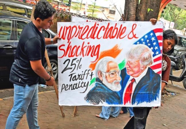 圖為當(dāng)?shù)貢r(shí)間8月1日,印度馬哈拉施特拉邦孟買,古魯庫爾藝術(shù)學(xué)院的學(xué)生們?cè)趯W(xué)校外舉著印度總理莫迪和美國總統(tǒng)特朗普的海報(bào),反對(duì)特朗普對(duì)印度加征關(guān)稅。 CFP供圖