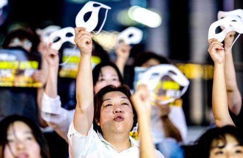 圖為當(dāng)?shù)貢r(shí)間2024年8月30日,韓國首爾,抗議者舉行示威,反對深度偽造色情片,活動(dòng)人士佩戴面具。 CFP供圖
