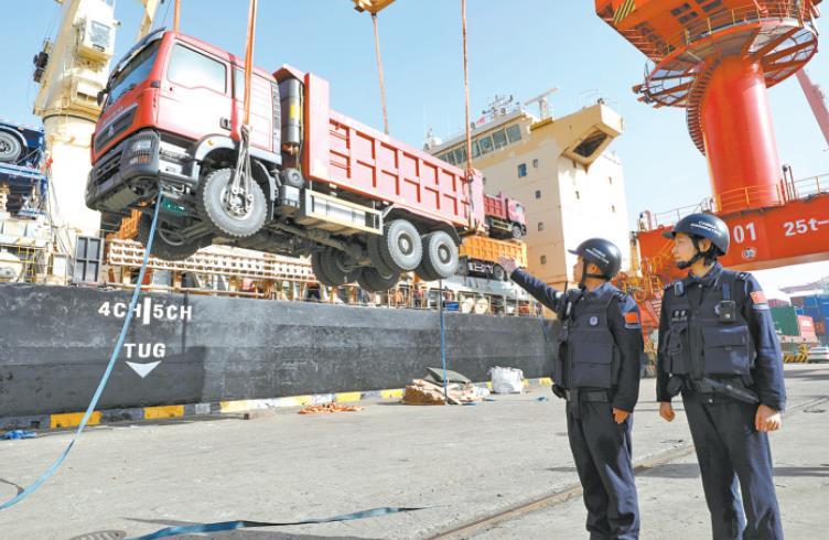 2025年11月28日,江蘇省張家港港務(wù)集團(tuán)有限公司碼頭一片忙碌,貨輪停在泊位上有序裝載385輛“中國(guó)制造”工程車,準(zhǔn)備駛往“一帶一路”共建國(guó)家肯尼亞。 CFP供圖