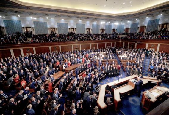 圖為當(dāng)?shù)貢r(shí)間2026年2月24日,美國(guó)總統(tǒng)特朗普在國(guó)會(huì)聯(lián)席會(huì)議上發(fā)表國(guó)情咨文。 CFP供圖