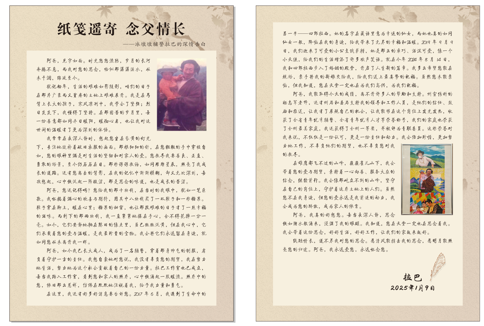 “阿爸,見(jiàn)字如面。時(shí)光悠悠流轉(zhuǎn),歲月的長(zhǎng)河奔騰不息,而我對(duì)您的思念,恰似那潺潺溪水,從未干涸,綿延至今。我常常在夜深人靜時(shí),想起您坐在昏黃的燈光下,專注地縫補(bǔ)著破舊衣服的畫面。那根細(xì)細(xì)的針,在您粗糙的手中穿梭自如,您的眼神里滿是對(duì)生活的堅(jiān)韌和對(duì)家人的愛(ài)。您教導(dǎo)我要善良、正直、勇敢的場(chǎng)景,至今仍歷歷在目。那些諄諄教誨,如同璀璨星辰,照亮了我成長(zhǎng)的道路。阿爸,您還記得嗎?您給我的那十塊錢,在當(dāng)時(shí)的我眼中,猶如一筆巨款。我懷揣著滿心的歡喜與期待,用其中八塊錢買了一雙鞋子和一些糖果。鞋子穿在腳上,暖在心里;糖果的甜蜜,也讓那段艱難的日子有了一絲幸福的滋味。而剩下的那兩塊錢,我一直緊緊地攥在手心,舍不得花掉一分一毫。如今,它們安靜地躺在陳舊的像夾里,雖已微微泛黃,但在我心中,它們承載著您的愛(ài)與溫暖,是我最珍貴的寶物。我會(huì)將它們永遠(yuǎn)留在身邊,就如同您從未離開(kāi)我一樣。在這里,我還有好多好消息要告訴您。2017年6月,我遇到了生命中的另一半——四郎拉西。她的名字在藏語(yǔ)里意為幸運(yùn)的仙女,而她也真的如同仙女一般,降臨在我的身邊,給我?guī)?lái)了無(wú)盡的幸福和溫暖。2019年9月9日,我們迎來(lái)了可愛(ài)的小公主俄薩措,她是那么的乖巧、活潑可愛(ài),像一個(gè)小天使,給我們的生活增添了許多歡聲笑語(yǔ)。在雄鷹都飛不過(guò)的山峰,巍巍雀兒山下,我會(huì)帶著您的愛(ài)與期望,秉持著一心向善、服務(wù)大眾的信念,繼續(xù)前行。我會(huì)像那屹立不倒的山峰,堅(jiān)守在自己的崗位上,守護(hù)著這片土地上的人們。雖然您不在我身邊,但您的愛(ài)永遠(yuǎn)是我前進(jìn)的動(dòng)力,我會(huì)成為您的驕傲,成為家人的依靠?!边@是一封來(lái)自德格縣的輔警拉巴寫給父親的信,信件以樸素的詞匯表達(dá)了對(duì)已故父親的思念,以及自己將謹(jǐn)遵父親教誨,努力在崗位上發(fā)光發(fā)熱的決心。