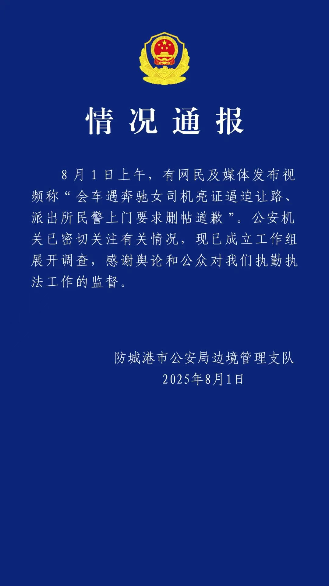 8月1日晚,防城港市公安局邊境管理支隊發(fā)布情況通報:8月1日上午,有網(wǎng)民及媒體發(fā)布視頻稱“會車遇奔馳女司機(jī)亮證逼迫讓路、派出所民警上門要求刪帖道歉”。公安機(jī)關(guān)已密切關(guān)注有關(guān)情況,現(xiàn)已成立工作組展開調(diào)查,感謝輿論和公眾對我們執(zhí)勤執(zhí)法工作的監(jiān)督。