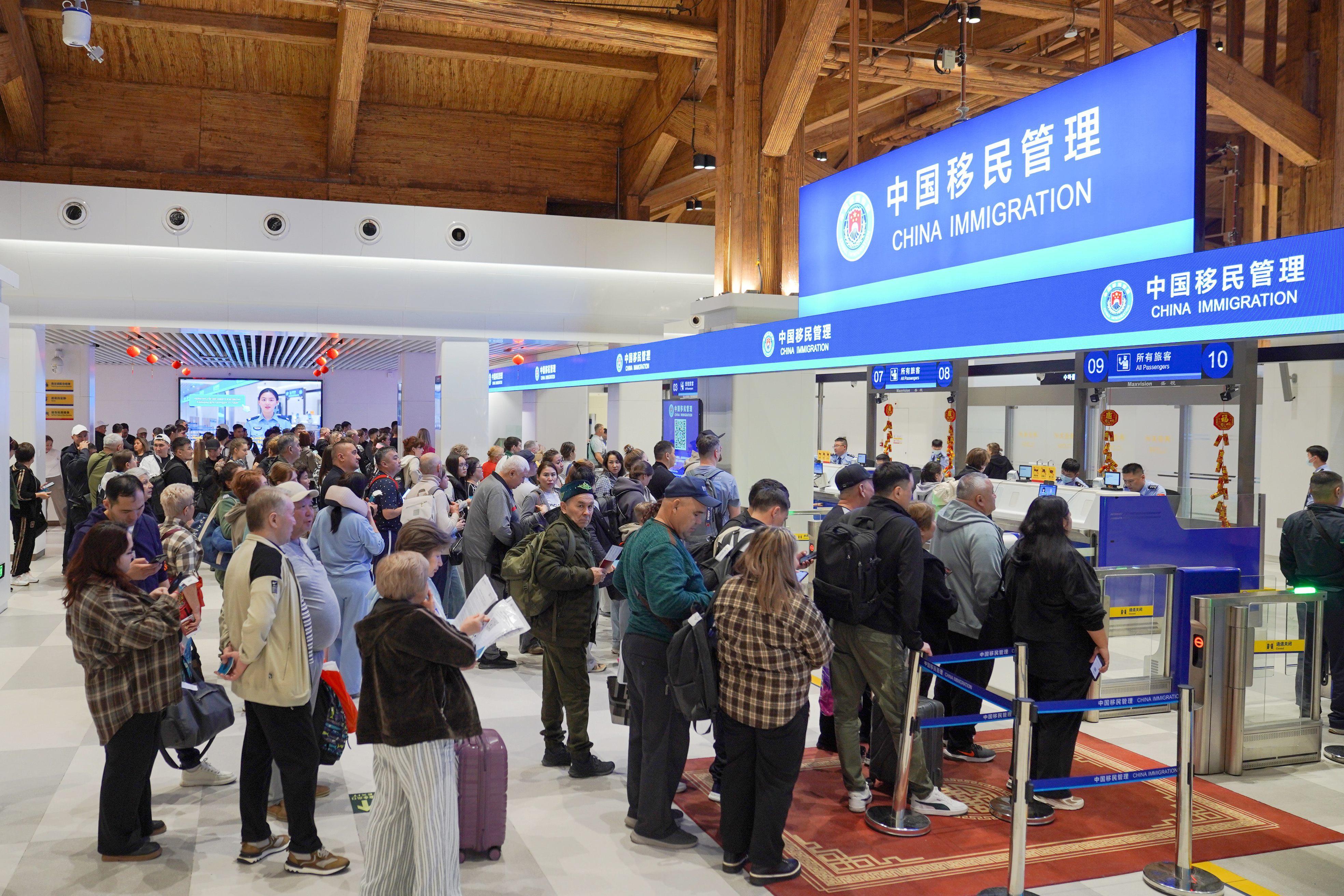 “謝—謝—!”一位正在辦理出境手續(xù)的俄羅斯旅客,耐心教懷抱中的孩子用中文向民警表達(dá)謝意。在這里,許多俄羅斯旅客即便不會說英語,也能熟練用中文說一句“謝謝”。