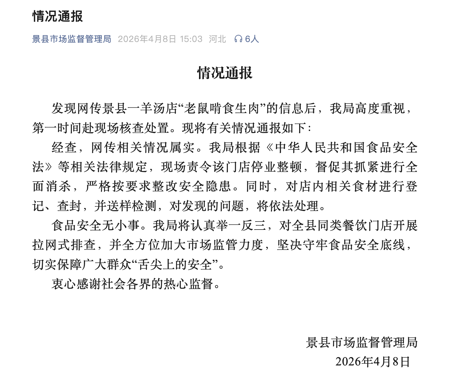 4月8日,景縣市場(chǎng)監(jiān)督管理局發(fā)布情況通報(bào)稱,發(fā)現(xiàn)網(wǎng)傳景縣一羊湯店“老鼠啃食生肉”的信息后,該局高度重視,第一時(shí)間赴現(xiàn)場(chǎng)核查處置?,F(xiàn)將有關(guān)情況通報(bào)如下: